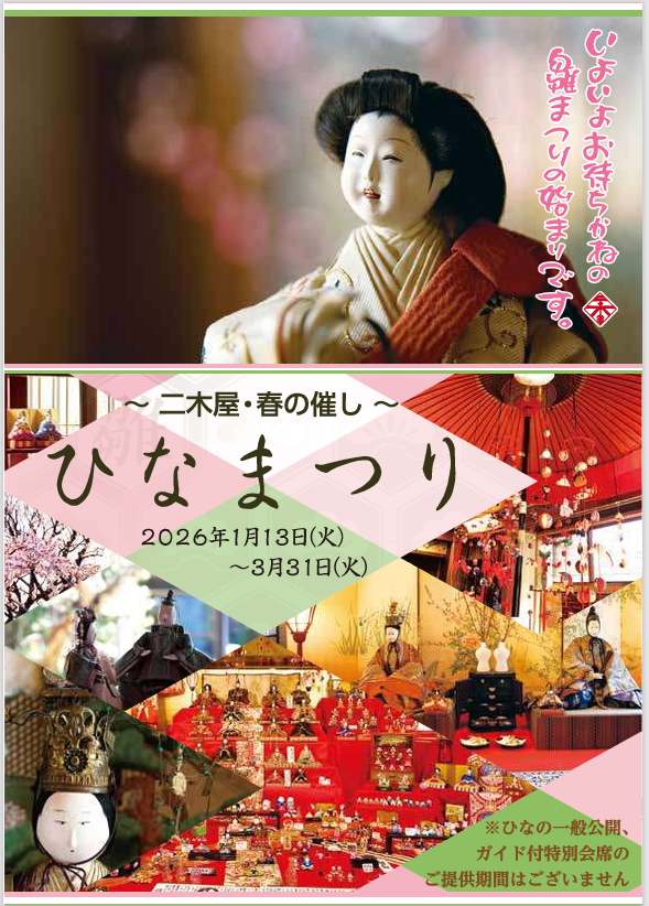 トップお知らせ二木屋のひな祭り 2026.01.28 お知らせ 二木屋のひな祭り いつも当店をご愛顧いただき誠にありがとうございます。 今年も二木屋ひな祭りの時期が訪れました。 3月31日(火)まで、おひな様に彩られた店内で皆様をお迎え致します。 ひな祭り仕立のお食事を楽しんだ後は、ぜひ離れ『浅倉』の展示もご覧ください。 一般公開は今年もございませんが、その分お席の数は 通常営業と変わらない席数でご用意しております。 楽しい時間をお過ごしください。 皆様のご予約を心よりお待ちしております。 前の記事へ 一覧へ戻る 次の記事へ